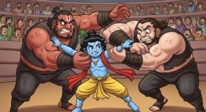भगवान कृष्ण और बलराम का चाणूर और मुष्टिक से महान युद्ध। जानिए कैसे कृष्ण ने कंस के शक्तिशाली पहलवानों को हराकर धर्म की स्थापना की।