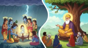 गुरु नानक जी द्वारा सुनाई गई कृष्णा जन्मस्थान की पवित्र कथा। जानिए कैसे भगवान कृष्ण का जन्म हुआ और क्या शिक्षा मिलती है इस कथा से।