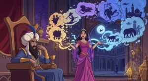 राजकुमारी शहरजाद की बुद्धि और कहानी सुनाना की कला से कैसे बादशाह का दिल बदला और उसने अपना जीवन बचाना। बुद्धि की जीत की प्रेरणादायक कहानी।
