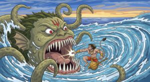 हनुमान जी की वीरता की कहानी जब उन्होंने समुद्र में छाया पकड़ने वाली सिंहिका राक्षसी का वध किया। बुद्धि और साहस से भरी यह प्रेरणादायक कथा।
