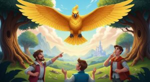 तीन भाइयों की कहानी जिसमें सुनहरा पक्षी चुराता था फल। छोटे राजकुमार के धैर्य से मिला समाधान। दुर्लभ पक्षी से मित्रता की प्रेरणादायक कहानी।