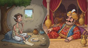 बीरबल की बुद्धिमानी से जानिए कैसे कवि और धनवान आदमी के बीच झगड़ा सुलझा। कविता और धन के बीच संतुलन की प्रेरणादायक कहानी।