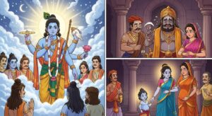 भगवान विष्णु का अवतार निर्णय और कृष्ण जन्म की पावन कथा। जानिए कैसे धरती माता की पुकार पर भगवान ने कृष्ण रूप में जन्म लेकर अधर्म का नाश किया।