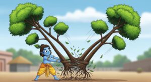भगवान कृष्ण की अद्भुत लीला – यमलार्जुन वृक्षों का उद्धार। जानिए कैसे छोटे कन्हैया ने श्रापित नलकूबर और मणिग्रीव को मुक्ति दिलाई।