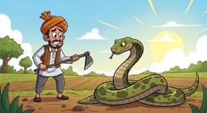 दयालु किसान और धोखेबाज सांप की प्रेरणादायक कहानी। जानिए कैसे एक किसान ने सांप की जान बचाई और क्या सीख मिली। बच्चों के लिए शिक्षाप्रद कहानी।