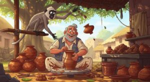कुम्हार और बंदर की प्रेरणादायक कहानी। जानिए कैसे धैर्य और समझदारी से शरारती बंदर बना कुम्हार का सबसे अच्छा दोस्त। बच्चों के लिए शिक्षाप्रद कहानी।