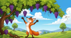 चतुर लोमड़ी और मीठे अंगूर की प्रेरणादायक कहानी। जानिए कैसे गिन्नी लोमड़ी ने अंगूर पाने की कोशिश की और क्या सीख मिली। बच्चों के लिए शिक्षाप्रद कहानी।