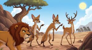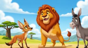 सिंह, गीदड़ और गधा की रोचक पंचतंत्र कहानी। जानिए कैसे चालाक गीदड़ ने भोले गधे को धोखा दिया और क्या सबक मिलता है इस शिक्षाप्रद कहानी से।