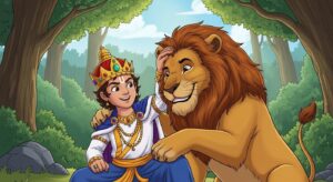 राजा भरत और सिंह की अनोखी मित्रता की प्रेरणादायक कहानी। जानें कैसे दया और सहायता का फल मिलता है। बच्चों के लिए नैतिक शिक्षा से भरपूर पंचतंत्र की कहानी।