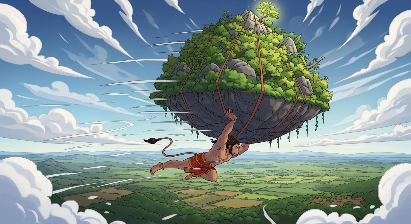 हनुमान जी ने सोचा, “समय बर्बाद नहीं करना चाहिए। लक्ष्मण भैया के प्राण संकट में हैं।” उन्होंने निर्णय लिया कि पूरे पर्वत को ही उठाकर ले चलेंगे।
